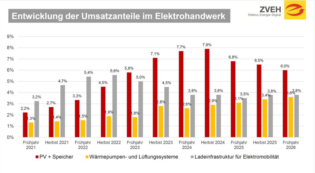 Die ZVEH-Frühjahrskonjunkturumfrage zeigt weitere Verschlechterungen zum Herbst 2025. Die Stimmung trübt sich weiter ein. Auftragspolster schmelzen ab und die Betriebe gehen zunehmend von einer Verschlechterung der weiteren Geschäftslage aus. Auch der Geschäftsklimaindex sank nochmals – von 68,8 Punkten im Herbst 2025…
