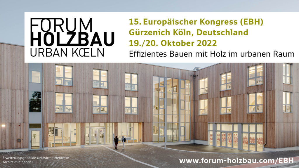 Genau hier setzt der Kongress „EBH“ von FORUM HOLZBAU an. Mit seinem 15. Kongress „Effizientes Bauen mit Holz im urbanen Raum“ bietet FORUM HOLZBAU am 19. und 20. Oktober in Köln Baufachleuten wieder eine hervorragende Möglichkeit, sich über das städtische Bauen mit dem Klimaschutz-Baustoff Holz zu informieren und sich mit Kollegen auszutauschen. Der Kongress hatte zuletzt 700 Teilnehmende und ist damit die grösste Holzbautagung in Deutschland. Er wird, wie in den Vorjahren, wieder gemeinsam von FORUM HOLZBAU und der Architektenkammer Nordrhein-Westfalen sowie dem Landesbeitrat Holz NRW durchgeführt. Begleitet ist er von einer grossen Fachausstellung der Ausrüster und Branchendienstleister.