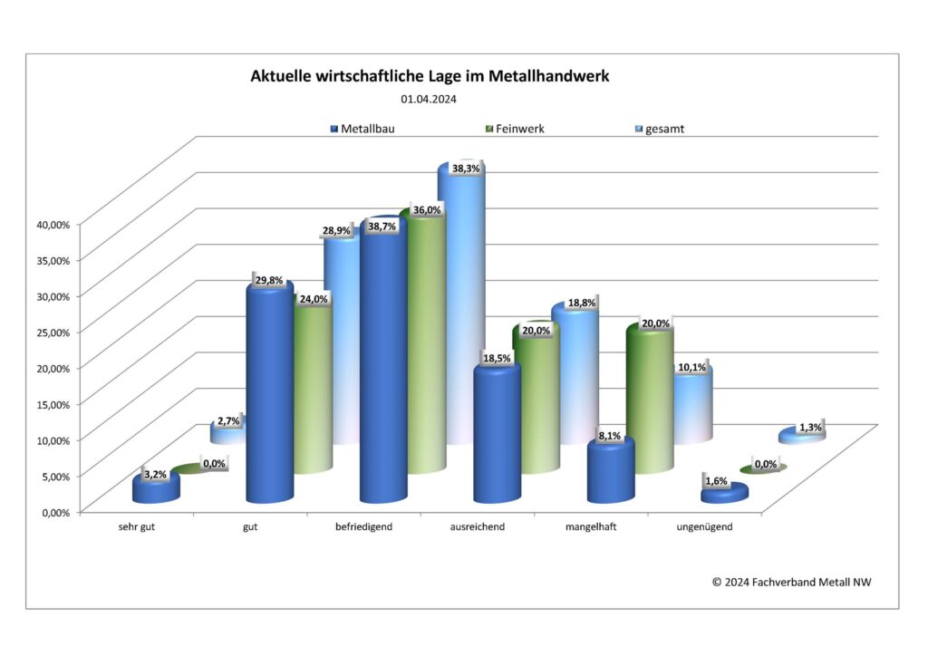 Zum Ende des ersten Quartals 2024 sinkt die Skepsis metallhandwerklicher Unternehmen merklich. Dessen ungeachtet bleiben große Herausforderungen, insbesondere die hohen bürokratischen Aufwendungen, die weiterhin unklaren wirtschaftlichen Entwicklungen und der Fachkräftemangel sind offene Flanken erfolgreichen Handelns.