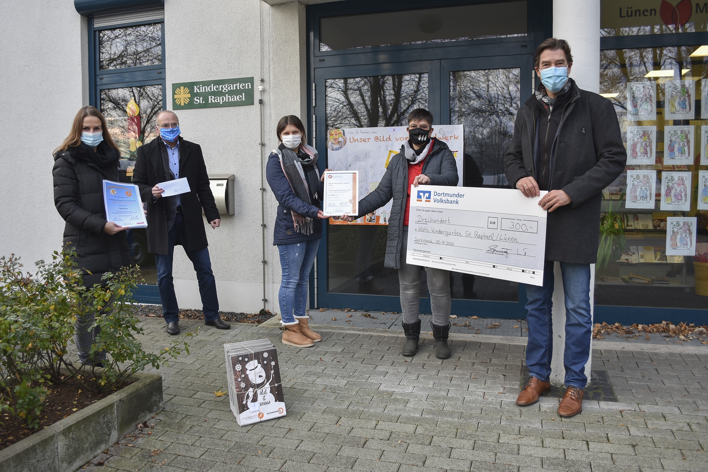 Einen Scheck über 300 Euro gab es für den katholischen Kindergarten St. Raphael in Lünen. bei der Übergabe dabei waren (v. l.) Regionalgeschäftsführerin Claudia Baumeister von der IKK classic, Geschäftsführer der Kreishandwerkerschaft Dortmund und Lünen Ludgerus Niklas, Erzieherin Sarina Rüping, Kindergartenleiterin Ingrid Küssner und Stadthandwerksmeister Christoph Haumann.