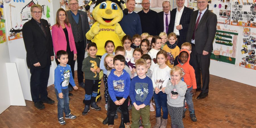Die Kreishandwerkerschaft hatte die Sieger-Kitas zur Preisverleihung in die Tischler-Werkstatt des Bildungszentrums Handwerk in Dortmund-Körne eingeladen. Im Bild hinten( v.l.): Kreishandwerksmeister Dipl.-Ing. Christian Sprenger, Regionalgeschäftsführerin Claudia Baumeister von der IKK classic, Geschäftsführer der Kreishandwerkerschaft Dortmund und Lünen Volker Walters, BVB-Maskottchen Emma, Sportlicher Leiter im Grundlagen- und Aufbaubereich des BVB Andreas Bath, Verkaufsleiter Dortmund der SIGNAL IDUNA Gruppe Marcel Fiege, Stv. Hauptgeschäftsführer der Kreishandwerkerschaft Dortmund und Lünen Ludgerus Niklas, Leiter der Gebietsdirektion Dortmund der SIGNAL IDUNA Gruppe Mirko Link, Hauptgeschäftsführer der Kreishandwerkerschaft Dortmund und Lünen Ass. Joachim Susewind.