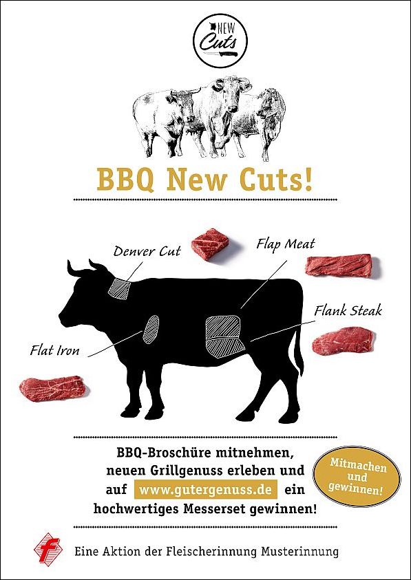 Der Deutsche Fleischer-Verband hat im Rahmen der Gemeinschaftswerbung 2019 für seine Innungen die Aktion „BBQ – New Cuts“ entwickelt. Ziel der Maßnahme ist es, Fleischerinnungen eine attraktive Innungswerbung mit überschaubarem Etat zu ermöglichen. Die Werbematerialien zu „BBQ – New Cuts“ sind attraktiv und zeitgemäß gestaltet, gerade das Thema „BBQ“ bietet zudem viele gute Anknüpfungspunkte, das Fleischerhandwerk als fachkompetent und aktuell darzustellen. Es kann zudem von Wettbewerbern nur schwer aufgenommen werden.