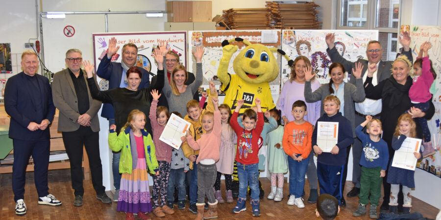 Die Kreishandwerkerschaft hatte die Sieger-Kitas zur Preisverleihung in die Tischler-Werkstatt des Bildungszentrums Handwerk in Dortmund-Körne eingeladen. Im Bild ( v.l. hinten) u.a.: Sportlicher Leiter im Grundlagen- und Aufbaubereich des BVB Andreas Bath, Geschäftsführer der Kreishandwerkerschaft Dortmund Hagen Lünen Volker Walters, Kreishandwerksmeister Bernd Marquardt, Kreishandwerksmeister Dipl.-Ing. Christian Sprenger, BVB-Maskottchen EMMA, stv. Hauptgeschäftsführer der Kreishandwerkerschaft Dortmund Hagen Lünen Joachim Susewind zusammen mit Erzieherinnen, Erziehern und Kindern der Sieger-Kitas.