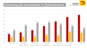Bei den Wärmepumpen und Lüftungssystemen kletterte der Umsatzanteil im gleichen Zeitraum von 1,5 auf 2,6 Prozent. Im Bereich der Elektromobilität hingegen sank der Umsatzanteil zwischen Frühjahr 2022 und Frühjahr 2024 von 5,4 auf 3,8 Prozent. Dies ist eine Folge der geänderten Förderpolitik der Bundesregierung und zeigt, welche tiefgreifenden strukturellen Änderungen und Unwägbarkeiten Politikwechsel mit sich bringen. Der ZVEH setzt sich deshalb für eine möglichst förderunabhängige nachhaltige und damit planbare Marktentwicklung ein.