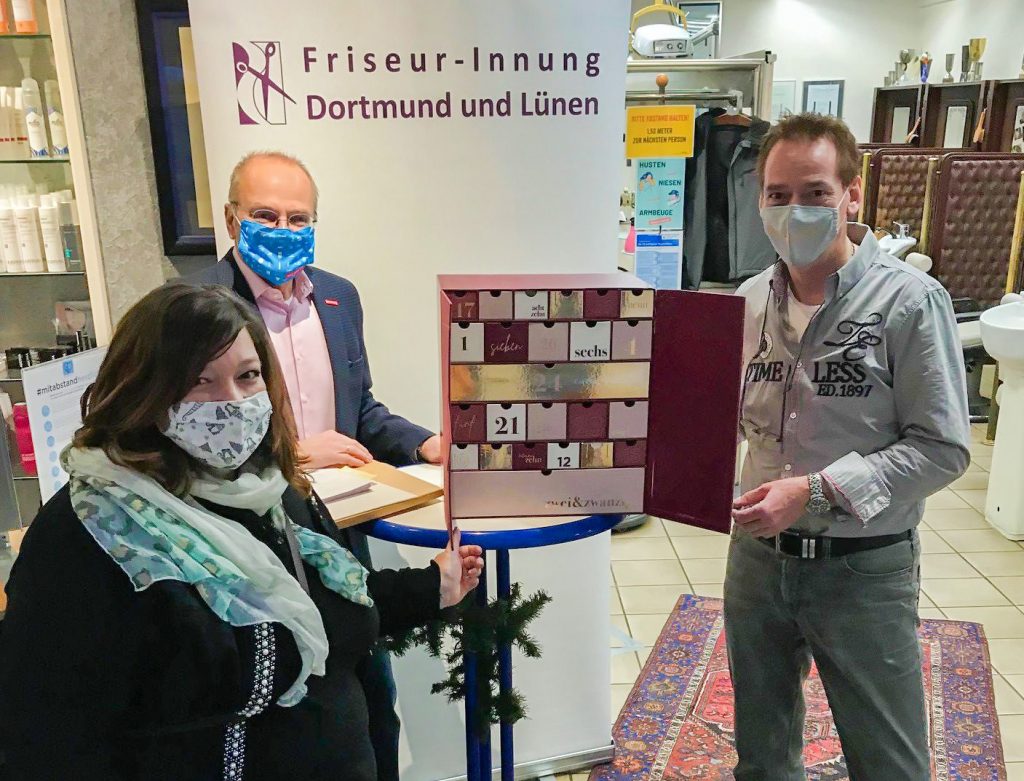 „Wir haben uns sehr über die rege Teilnahme der Instagram-Community gefreut“, erklärte Obermeister Frank Kulig am Ende der Verlosung. „Die Wünsche reichten von Schneiden und Waschen bis zu Färben, Strähnchen und sogar Lametta einflechten.“ Alles das, so der Obermeister, sei in den Salons des Dortmunder und Lüner Friseurhandwerks vor Weihnachten problemlos möglich – Terminreservierung allerdings erwünscht. Sonntag um Mitternacht, am Ende der ungewöhnlichen Aktion, stand dann die Gewinnerin fest: Kristina Bernhard aus Dortmund. Sie erhielt ihren Adventskalender passend am 1. Dezember von Obermeister Frank Kulig und Innungsgeschäftsführer Ludgerus Niklas überreicht. Was hinter dem ersten Türchen war, bleibt allerdings das Geheimnis von Kristina Bernhard
