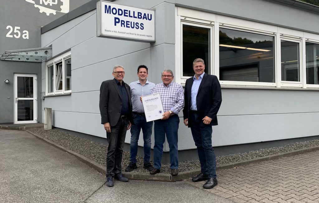 Am 01.08.2019 konnte die Preuß Modellbau GmbH in Ennepetal ihr 65-jähriges Firmenjubiläum feiern. Die von Hermann Preuß gegründete Firma wird von seinem Sohn Manfred Preuß sowie in 3. Generation von Sascha Preuß erfolgreich geführt. Zum Jubiläum gratulierten der Obermeister der Modellbauer-Innung für die Handwerkskammerbezirke Dortmund und Münster, Stephan Weischer (auf dem Foto rechts), sowie der Geschäftsführer der Innung Volker Walters.