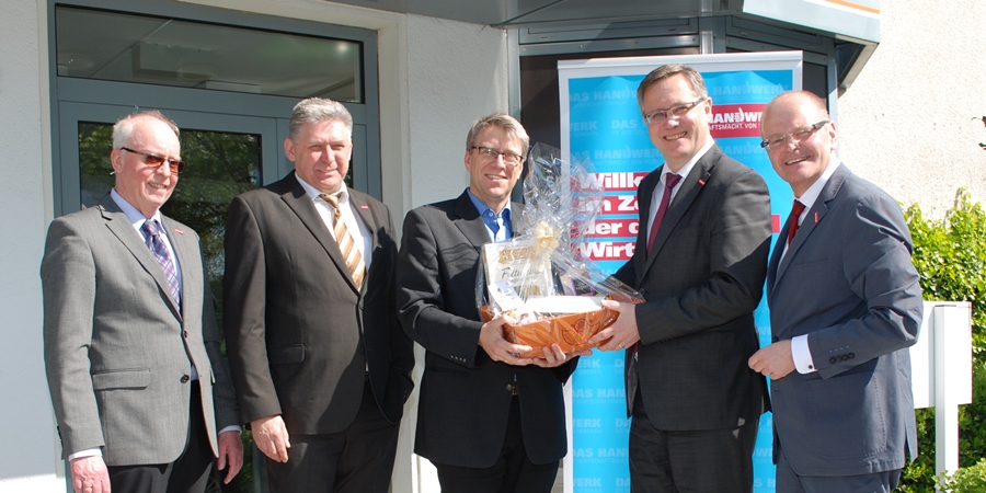 Dortmund. Da das eigentliche Jubiläum am 1. Mai auf einen Sonntag fiel, kamen die Glückwünsche erst am Montag: Mitglieder von Vorstand und Geschäftsführung der Kreishandwerkerschaft Dortmund und Lünen gratulierten Hauptgeschäftsführer Assessor Joachim Susewind herzlich zu seinem silbernen Dienstjubiläum. „Damit hatte ich gar nicht gerechnet“, entgegnete der bescheidene Jubilar, der seit Februar vergangenen Jahres die Verwaltung der Spitzenorganisation von 24 Innungen und insgesamt 4.800 Handwerksbetrieben in Dortmund und Lünen leitet. Kreishandwerksmeister Dipl.-Ing. Christian Sprenger dankte in einer kurzen persönlichen Ansprache dem Jubilar für 25 erfolgreiche Dienstjahre verbunden mit den besten Wünschen für die berufliche und private Zukunft.