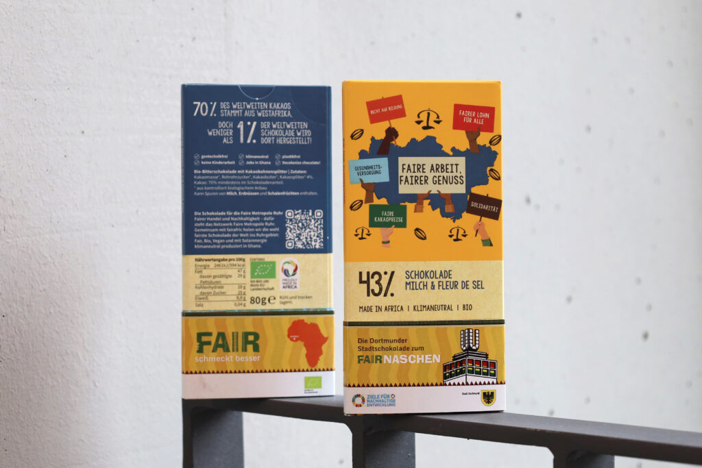 In einem Kooperationsprojekt zwischen dem Team Internationale Beziehungen der Stadt Dortmund und dem Fritz-Henßler-Berufskolleg (FHBK) haben Mediengestalter des FHBK im Rahmen ihrer schulischen Ausbildung neue Dortmund-Banderolen für die Ruhrgebietsschokolade entworfen. Seit dem letzten Jahr gibt es die neue, nachhaltige fairafric Ruhrgebietsschokolade mit einer speziellen Dortmund-Banderole, die in einem gemeinsamen Projekt der Fairen Metropole Ruhr e.V., elf weiteren Ruhrgebietskommunen und dem Regionalverband Ruhr auf den Markt gebracht wurde.