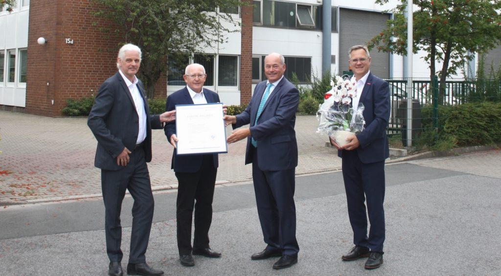 Am 27. August gratulierten Obermeister Thomas Pape und Geschäftsführer Joachim Susewind, Baugewerbe-Innung Dortmund und Lünen, der RUNDHOLZ Bauunternehmung zu ihrem 75-jährigen Jubiläum und 75 Jahren Mitgliedschaft in der Baugewerbe-Innung. Zu diesem Anlass überreichten sie eine Ehrenurkunde der Handwerkskammer Dortmund an Geschäftsführer Stefan Rundholz, der das Dortmunder Familienunternehmen heute in dritter Generation leitet, und seinen Vater Hanspeter Rundholz.