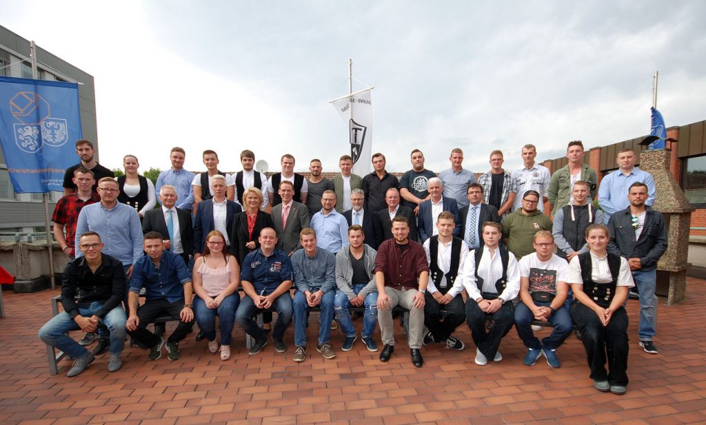 Mit einer Feier in den Ausbildungsstätten des Handwerks in Dortmund-Körne haben die Innungen der Baugewerke am Donnerstag ihre Auszubildenden freigesprochen. Insgesamt 76 Absolventen der Wintergesellenprüfung 2016/2017 und der Sommergesellenprüfung 2017 wurden offiziell in den Gesellenstand erhoben, darunter 22 Dachdecker, 8 Fliesenleger, 13 Maurer, 18 Straßenbauer und 15 Zimmerer. Eingeladen zu der gemeinsamen Freisprechungsfeier hatten die Baugewerbe-Innung Dortmund und Lünen, die Dachdecker-Innung Dortmund und Lünen, die Straßen- und Tiefbau-Innung Dortmund und die Stukkateur- und Zimmerer-Innung Dortmund und Lünen sowie die Fachgruppe Fliesen.