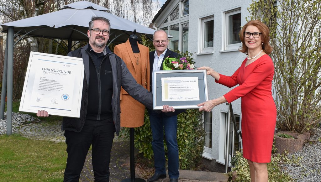 Sie gilt als Deutschlands bekannteste Schneiderin: Inge Szoltysik-Sparrer, Obermeisterin der Innung modeschaffendes Handwerk mittleres Ruhrgebiet kann auf das 40-jährige Betriebsjubiläum ihres Modeateliers in Hagen-Hohenlimburg zurückblicken. Bekannt wurde die außergewöhnliche Schneidermeisterin als Buchautorin, Leiterin einer eigenen Näh-Akademie, Video-Trainerin (z.B. Liveshow „Oh NÄH!“ auf Youtube), Jurorin der VOX-Show „Geschickt eingefädelt“ und Vorsitzende des Bundesverbandes der Maßschneider. Zum Jubiläum im corona-gerecht kleinen Kreis gratulierten jetzt der stellvertretende Obermeister Carsten Rumberg und Geschäftsführer Ludgerus Niklas von der Innung modeschaffendes Handwerk mittleres Ruhrgebiet, die ihren Sitz in Dortmund hat. Sie überbrachten Inge Szoltysik-Sparrer nicht nur die herzlichen Glückwünsche aller Innungsmitglieder, sondern auch eine Ehrenurkunde des Handwerks.
