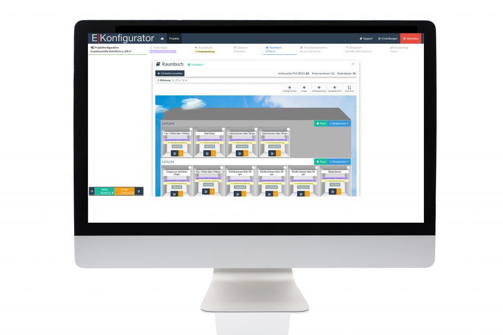 Das Werkzeug – an den E-Konfigurator sind mittlerweile mehrere Hundert Hersteller mit über 100.000 Produkten angebunden – führt automatisch durch den kompletten kaufmännischen Planungsvorgang und bietet dabei neben obligatorischen Grundkomponenten unterschiedliche Ausstattungskategorien und Technologien an. Der Wechsel von einer niedrigeren Ausstattungsvariante zu einer höherwertigen wie auch ein Technologiewechsel sind mit wenig Aufwand möglich. Praktisch: Am Ende des Planungsvorgangs werden automatisch der Materialbedarf und die benötigte Bauzeit als Preis berechnet.