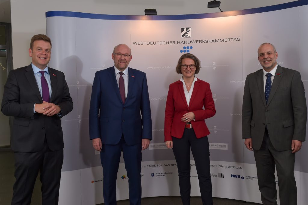 Zu den ersten Gratulanten des neuen Präsidenten gehörte Ina Scharrenbach, Ministerin für Heimat, Kommunales, Bau und Gleichstellung des Landes NRW, die zum Tagesordnungspunkt „Politiker im Dialog“ als Gast an der WHKT-Vollversammlung teilgenommen hatte. „Ich gratuliere Herrn Schröder zu seiner Wahl und wünsche ihm viel Erfolg für das neue Amt als Präsident des Westdeutschen Handwerkskammertages. Er verfügt über viel Erfahrung und das nötige Know-how. Nach einer Wahlperiode als Vizepräsident ist er zudem bestens auf die verantwortungsvolle Aufgabe vorbereitet. Ich freue mich auf die weitere Zusammenarbeit.“