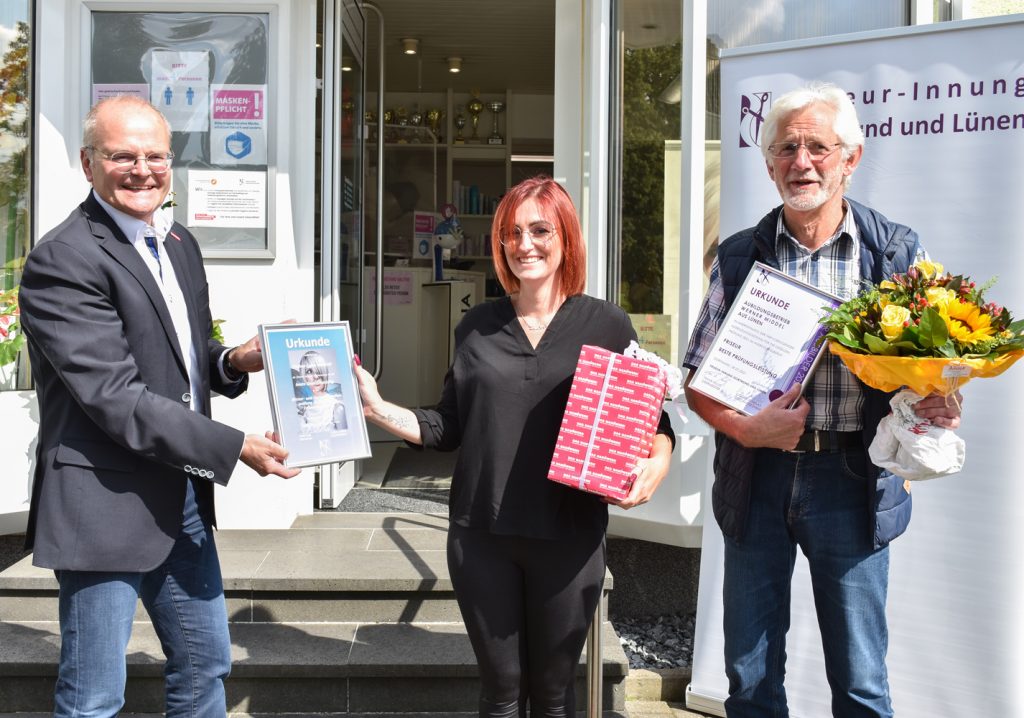 Auch wenn es in diesem Jahr erneut keine Freisprechungsfeier geben konnte, ließ es sich die Friseur-Innung Dortmund und Lünen nicht nehmen, ihrer besten Auszubildenden persönlich zu gratulieren. Thabea-Luisa Maletzki vom Friseursalon Middel aus Lünen schaffte es in diesem Jahr mit der Gesamtnote 2,0 an die Spitze von insgesamt 36 Prüflingen der Winter- und Sommergesellenprüfung. „Sie können sehr stolz auf sich sein, diese Leistung trotz der schwierigen Bedingungen in der Pandemie so gut geschafft haben“, lobte Geschäftsführer Ludgerus Niklas von der Friseur-Innung Dortmund und Lünen die 29-jährige Lünerin. „Und auch Ihrem Ausbildungsbetrieb gilt unser ganzer Respekt für diese Leistung.“ Als Anerkennung für herausragende Leistungen erhielten sowohl die frischgebackene Gesellin, die ihre Ausbildung in Teilzeit absolvierte, als auch Inhaber Werner Middel Urkunden der Innung aus der Hand des Geschäftsführers.