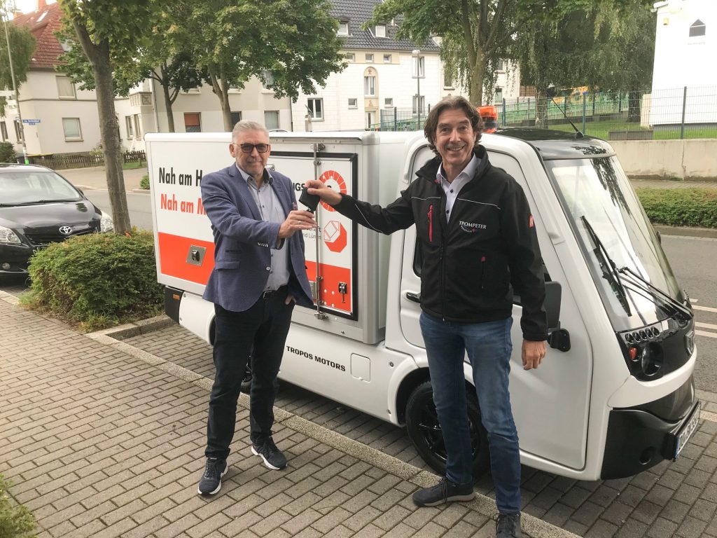 „Wir wollen unseren CO2-Fußabdruck deutlich verkleinern und der Stadtflitzer von Tropos mit seinen kompakten Maßen, der großen Ladefläche und einer Reichweite von bis zu 260 Kilometern hat uns überzeugt“, freut sich BKH-Geschäftsführer Volker Walters. Er bekam jetzt den Schlüssel aus der Hand von Christoph Haumann, dem Geschäftsführer des Lüner Autohauses Trompeter GmbH, das den „Tropos ABLE“ exklusiv in der Region vertreibt. Mit seinen 14 PS, einem kleinen Wendekreis, einer Zuladung von bis zu 700 Kilogramm und einer Breite von nur 1,40 Meter bietet sich der „Tropos“ nicht nur für Handwerker, sondern zum Beispiel auch für Kommunen, für Lieferservices, Gastgewerbe und Tourismus an.