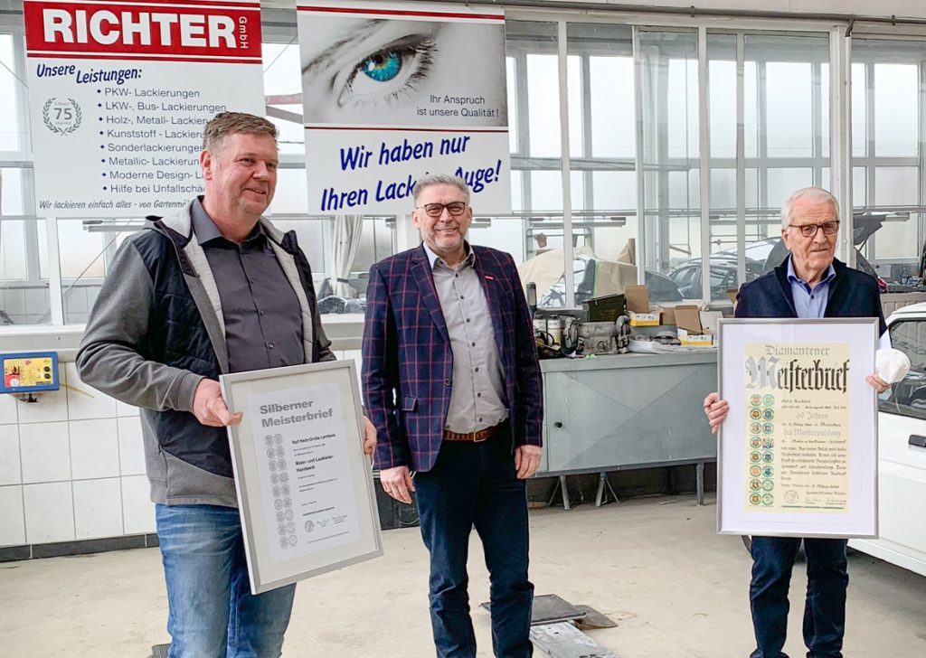 Gleich doppelten Grund zur Freude gab es jetzt bei der Autolackiererei Richter GmbH in Coesfeld. Seniorchef Otto Richter und sein Neffe Ralf Heitz-Große Lembeck erhielten aus den Händen von Volker Walters, dem Geschäftsführer des Fachverbands Lack- und Karosserietechnik Westfalen, Ehrenurkunden zu ihrem Meisterjubiläum im Handwerk. Otto Richter, der am 5. März 1960 seine Prüfung als Maler- und Lackierermeister vor der Handwerkskammer Münster ablegte, erhielt den diamantenen Meisterbrief für 60 erfolgreiche Jahre im Handwerk. Sein Neffe Ralf Heitz Große-Lembeck, der am 16. Februar 1995 seine Prüfung als Fahrzeug-Lackierermeister ebenfalls vor der Handwerkskammer Münster ablegte, erhielt den silbernen Meisterbrief für 25 meisterliche Jahre. „Die beiden Urkunden, die ich Ihnen heute im Namen unseres Fachverbands und der Handwerkskammer überreiche, sind ein beeindruckendes Zeugnis Ihrer persönlichen Leistung, aber auch der hohen Qualität Ihres Unternehmens“, so Geschäftsführer Volker Walters in seiner Laudatio. „Wer einen Familienbetrieb über so viele Generationen erfolgreich führt, muss hervorragende handwerkliche Arbeit leisten. Zu diesem außergewöhnlichen Ereignis beglückwünsche ich Sie beide.“