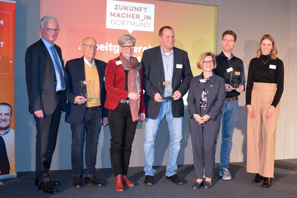 (v. l.): Thomas Schäfer (Geschäftsführer Handelsverband Nordrhein-Westfalen, Westfalen-Münsterland, Laudator), Reinhard Bräunig, (Seniorchef der Pool & Sauna Bräunig GmbH, Preisträger), Dr. Regine Schmalhorst (Geschäftsführerin des Jobcenter Dortmund), Carsten Möllemann (Geschäftsführer der FQ Umwelttechnik, Preisträger), Heike Bettermann (Vorsitzende der Geschäftsführung der Arbeitsagentur Dortmund, Laudatorin), Stefan Juhnke (Geschäftsführer der bitpiloten GmbH, Preisträger) und Corinna Borgmann (Direktorin Personal der Borussia Dortmund, Laudatorin)