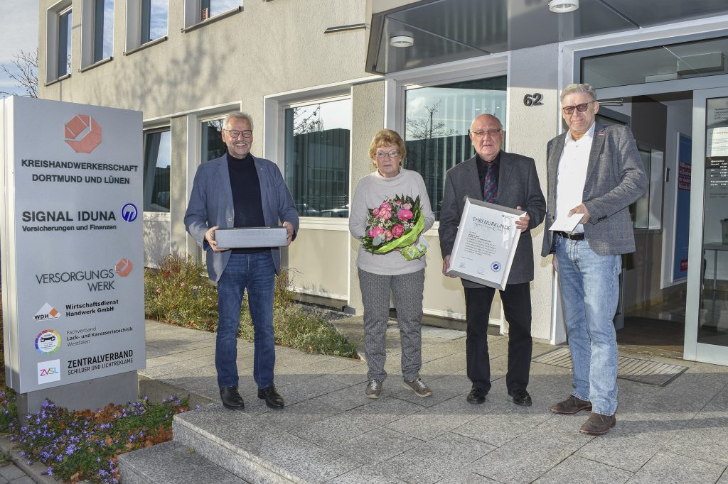 Auf 40 erfolgreiche Jahre im Fahrzeuglackiererhandwerk kann die Autolackiererei Geist in Ennepetal zurückschauen. 1981 wurde das Familienunternehmen, das sich auf qualitativ hochwertige Fahrzeuglackierung und Karosserie-Instandsetzung spezialisiert hat, von Heinrich Geist gegründet. Anlässlich des Jubiläums war der Senior des Familienbetriebs, der auch heute noch mit 75 Jahren die Geschäftsleitung innehat, zusammen mit seiner Frau nach Dortmund zum Fachverbands Lack- und Karosserietechnik Westfalen eingeladen worden. Dort erhielt der Lackierermeister aus den Händen des Verbandsvorsitzenden Heinz-Bernd Raue und des Geschäftsführers Volker Walters eine Ehrenurkunde des Handwerks verliehen. „Es ist eine ganz besondere Leistung, wenn ein Handwerksbetrieb, wie Sie ihn in Ennepetal gegründet haben, sich vier Jahrzehnte erfolgreich am Markt behaupten kann“, so Heinz-Bernd Raue. „Dieser Erfolg ist immer auch eng verbunden mit einem großen persönlichen Einsatz der ganzen Familie. Darum gratuliere ich Ihnen und Ihrer Frau persönlich sehr herzlich zum Jubiläum.“