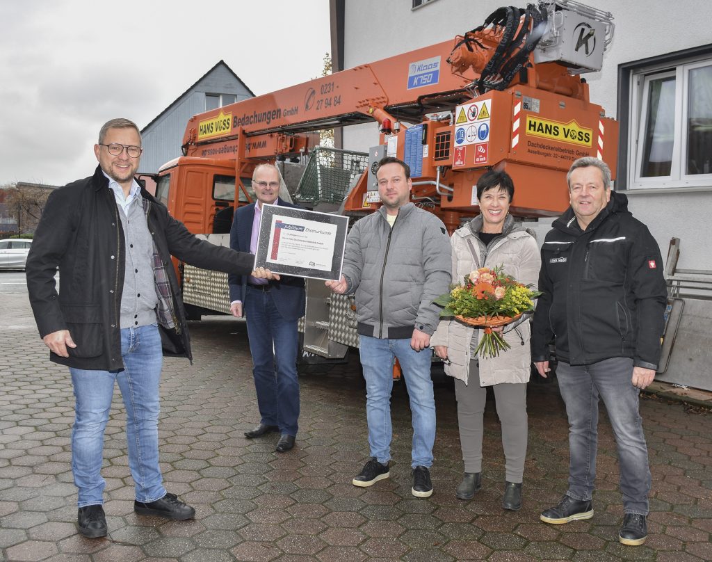 Keine große Jubiläumsfeier, dafür aber hohen Besuch gab es jetzt anlässlich des 75-jährigen Betriebsjubiläums bei der Hans Voss Dachdeckereibetrieb GmbH in Dortmund-Asseln. Dirk Sindermann, Obermeister der Dachdecker Innung Dortmund und Lünen, und Geschäftsführer Ludgerus Niklas waren persönlich an die Asselburgstraße gekommen, um Dachdeckermeister Dieter Armann und seiner Frau zum 75-jährigen Bestehen ihres Betriebes zu gratulieren. „Es zeugt von der hohen Qualität Ihrer Arbeit, dass Ihr Betrieb ein dreiviertel Jahrhundert erfolgreich gemeistert hat“, so der Obermeister bei der Übergabe der Ehrenurkunde der Innung. „Die Betriebe des Dachdeckerhandwerks in Dortmund und Lünen gratulieren sehr herzlich und wünschen Ihnen weiterhin viel Erfolg in unserem ehrbaren Handwerk.“