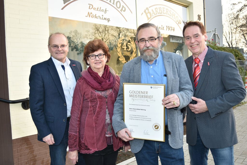 Sein goldenes Jubiläum als Meister im Friseurhandwerk konnte jetzt der Lüner Detlef Nöhring feiern. Anlässlich des Jubiläums waren der stellvertretende Kreishandwerksmeister und Obermeister der Friseur-Innung Dortmund und Lünen, Frank Kulig, und Innungsgeschäftsführer Ludgerus Niklas eigens nach Lünen gereist. Dort überreichten sie den Goldenen Meisterbrief, ausgestellt von der Handwerkskammer Dortmund, verbunden mit den besten Wünschen der Innung an den Jubilar und seine Gattin Uschi Nöhring.