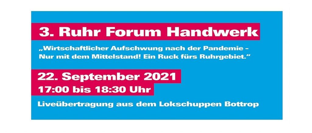 Kurz vor der Bundestagswahl fragt das Handwerk im Ruhrgebiet die großen Parteien, was sie für den wirtschaftlichen Aufschwung nach der Pandemie und die Stärkung des Mittelstands tun. Unter dem Motto „Ein Ruck fürs Ruhrgebiet“ haben die Handwerkskammern (HWK) Dortmund, Düsseldorf und Münster Politiker zur Diskussion auf dem 3. Ruhr Forum am 22. September von 17 bis 18:30 Uhr in den Lokschuppen in Bottrop eingeladen. Angemeldete Interessenten können die Veranstaltung im Live-Stream mitverfolgen und Fragen über den Chat stellen.