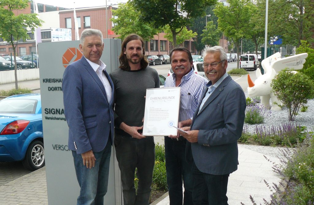 Die Fachgruppe freut sich, Günter Franke und Sohn Dennis auch im Namen der Handwerkskammer herzlich in der Geschäftsstelle gratulieren zu können und überreicht eine Ehrenurkunde, Glückwünsche und ein kleines Präsent.“