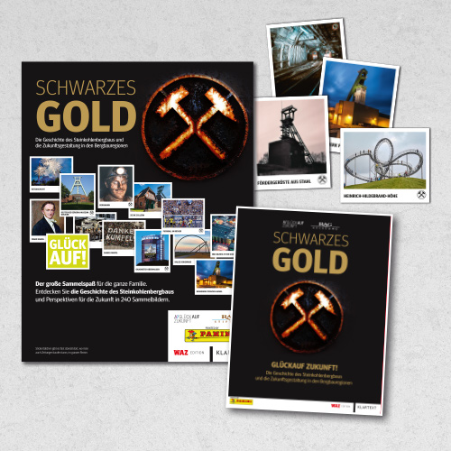 Schicht im Schacht: Noch in diesem Jahr schließt mit Prosper Haniel auch die allerletzte Zeche im Ruhrgebiet. Zum Ende dieser Ära haben der FUNKE-Buchverlag Klartext und die FUNKE-Zeitung WAZ ein Sammelalbum über die Geschichte des Bergbaus und die Zukunftsgestaltung in der Region produziert. Das Album „Schwarzes Gold! Sammeln, kleben, erleben“ – ein Stück Ruhrgebietsgeschichte auf 240 originalen Panini-Stickern liegt am Samstag, 20. Januar, der Gesamtauflage der WAZ bei. Es ist in Zusammenarbeit mit „Juststickit“ und in Kooperation mit der RAG-Stiftung sowie zahlreichen WAZ-Leserinnen und -Lesern entstanden, die eigene Fotos eingesendet haben.
