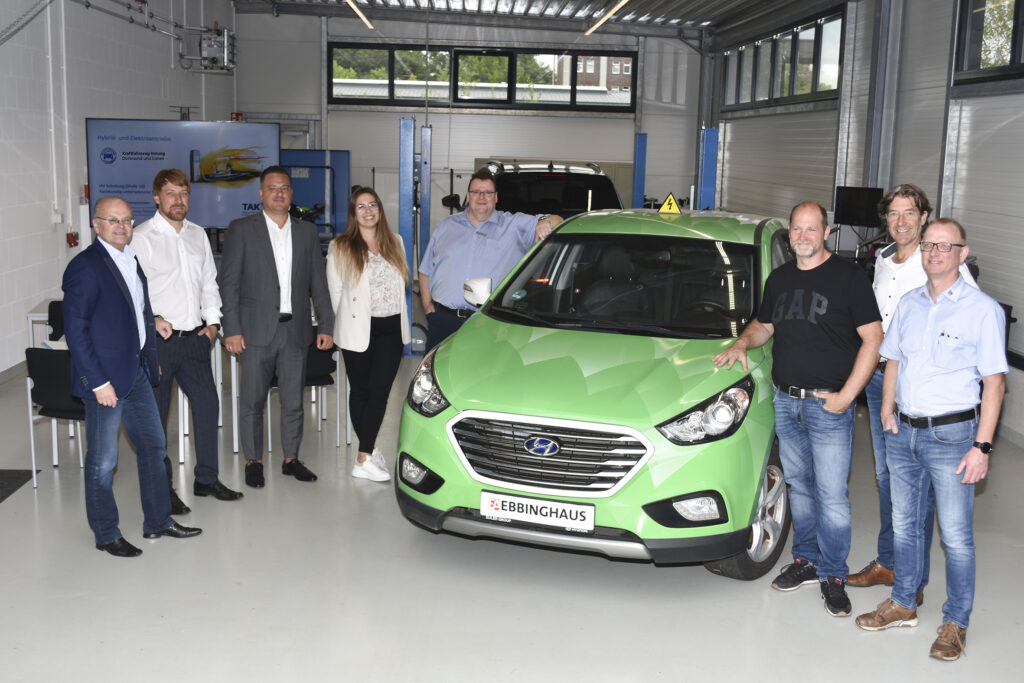 Die Schulungsstätte der Kfz-Innung in Derne mit dem neuen Brennstoffzellen-Fahrzeug ( v. l.): Ludgerus Niklas (Innungsgeschäftsführer), Paul-Jan Ebbinghaus (Geschäftsführer Ebbinghaus Automobile GmbH), Martin Koch (Distriktleiter Aftersales Hyundai Motor Deutschland GmbH), Mandy Sander (Assistenz Ebbinghaus Automobile GmbH), Roland Schwarz (Gesamtserviceleiter Ebbinghaus Automobile GmbH), Reimund Peters (Referent Schulungsstätte), Christoph Haumann (Obermeister der Kraftfahrzeug-Innung Dortmund und Lünen) und Stephan Rauschning (Ebbinghaus Automobile GmbH).