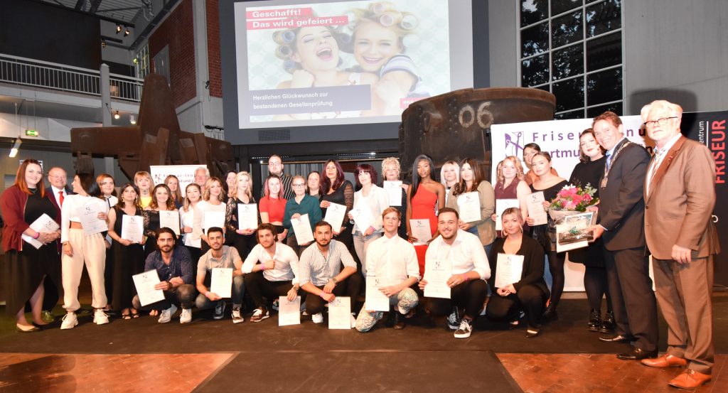 Mit rund 200 Gästen war die Stahlhalle der DASA Arbeitswelt Ausstellung in Dortmund-Dorstfeld am Sonntag gut gefüllt. Eingeladen hatte die Friseur-Innung Dortmund und Lünen zur Freisprechungsfeier der Auszubildenden des Friseurhandwerks im Rahmen der Hair-Show, dem Trend-Fenster der Branche. In den Gesellenstand erhoben wurden 39 Azubis aus der Sommergesellenprüfung 2019 und 14 Azubis aus der Wintergesellenprüfung 2018/19. Die Gäste, darunter Eltern und Freunde, Ausbildungsbetriebe sowie Lehrer und zahlreiche Ehrengäste, gratulierten den ehemaligen Auszubildenden. Frank Kulig, Obermeister der Friseur-Innung Dortmund und Lünen, fand in seiner Ansprache feierliche Worte: „Sie sind die Zukunft, freuen Sie sich, Sie haben es geschafft und werden nun dringend gebraucht. Bilden Sie sich weiter – wir von der Innung stehen mit unserem Angebot an fachlichen Aus- und Weiterbildungsmaßnahmen mit Rat und Tat zur Seite und freuen uns, Sie in diesem kreativen Beruf zu unterstützen.“ Der Dank des Obermeisters galt auch den Ausbildungsbetrieben, dem Berufskolleg und dem Prüfungsausschuss, die zur ausgezeichneten Ausbildung der Gesellinnen und Gesellen beigetragen hatten. Als Prüfling mit der besten Leistung wurde Laura Schinke vom Dortmunder Salon Quartier Friseure Katrin Klagges geehrt.