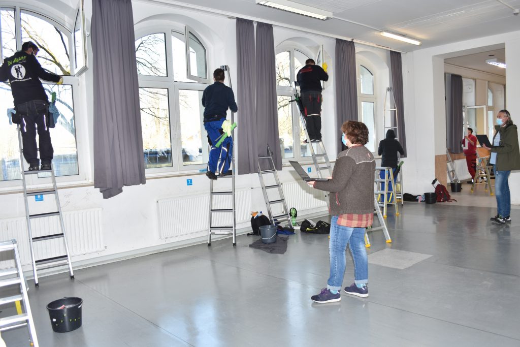 Fast alle Gesellenprüfungen sollen nun nach den Plänen der Innung bis auf Weiteres in Derne durchgeführt werden. Eine erhebliche Summe hat die Standesorganisation dazu in die Anschaffung neuer Reinigungsgeräte, Tablets, Leitern und Materialien investiert, die zu den Prüfungen zur Verfügung gestellt werden. Bei den ersten Prüfungen des „Teil 1“ der neuen gestreckten Gesellenprüfung* – der ehemaligen Zwischenprüfung – ging es Ende März dann auch gleich kräftig zur Sache. In einem simulierten Kundenauftrag mussten täglich rund 20 Auszubildende eine Woche lang gegenüber zwei Prüfungskommissionen zeigen, wie gut sie fachlich arbeiten können. „Die Prüflinge müssen in jeweils zwei Stunden einen theoretischen und einen praktischen Teil bestehen”, erklärt Ramon Knauf, Mitglied des Prüfungsausschusses der Innung. „Es gilt, das Reinigungsobjekt genau zu beurteilen, ein Aufmaß zu erstellen, die richtigen Reinigungsmittel zu wählen und den Auftrag – zum Beispiel eine Unterhaltsreinigung, die Reinigung von Fenstern oder Teppichböden – perfekt durchzuführen.“ Die Ergebnisse werden währenddessen von den Prüfern akribisch digital per Tablet und Laptop erfasst. Insgesamt lassen sich in der ehemaligen Hauptschule viele unterschiedliche Reinigungsaufträge auch mit unterschiedlichen Oberflächen perfekt darstellen. „Das Objekt ist für uns ideal“, freute sich auch Innungsgeschäftsführer Volker Walters anlässlich der ersten Prüfungen. „Und gleichzeitig erfüllen wir noch einen guten Zweck, indem wir die Immobilie pflegen und den Leerstand vermeiden.“ Unterstützt wird das Projekt logistisch vom Dortmunder Bildungskreis Handwerk e.V., der unter seinem Ausbilder Holger Czarnik das Management der Verbrauchsmaterialien und Lagerbestände innehat. Schon im Mai sollen nun die nächsten Prüfungen stattfinden.