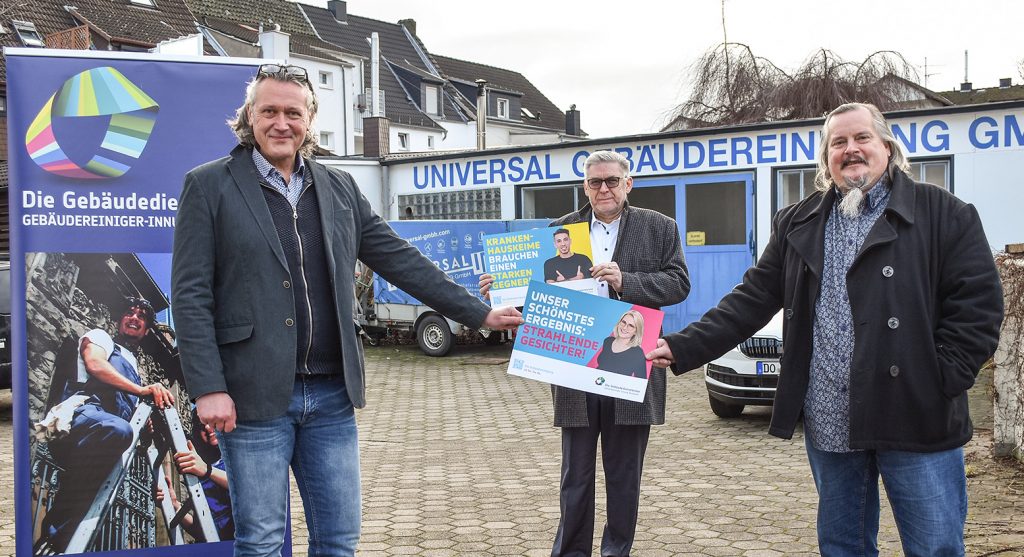 Mit frechen und bunten Kampagnen-Motiven wollen die Gebäudereiniger dabei auf sich aufmerksam machen. 15 „echte“ Gebäudereinigerinnen und Gebäudereiniger geben den Fotomotiven und Videos der Kampagne im wahrsten Sinne des Wortes ein Gesicht. Mit Wortwitz und Augenzwinkern, aber auch mit starken Fakten zeigen sie auf Plakaten und in sozialen Medien: Wir sind ein modernes und zukunftssicheres Dienstleistungshandwerk. Zu den ersten Empfängern der Kampagnen-Plakate gehörte jetzt die Universal Gebäudereinigung GmbH in Holzwickede. Geschäftsführer Ramon Knauf nahm das erste Exemplar persönlich aus den Händen von Obermeister Kai-Gerhard Kullik und Innungsgeschäftsführer Volker Walters entgegen. Gleichzeitig bekommt jeder Innungsbetrieb zurzeit für seine Beschäftigten Aufkleber mit dem Slogan: „Ich bin stolz, ein Gebäudereiniger zu sein.“ Diese sollen später ein Teil von zwei Gewinnspielen werden, die die Innung auf Instagram und Facebook startet. „Wir wollen möglichst umfassend in allen Medien über unser neues Berufsbild informieren“, erklärt dazu Geschäftsführer Volker Walters. „Die Corona-Pandemie hat vielen Menschen bereits gezeigt, wie wichtig Hygiene, Sauberkeit und Sicherheit sind und dass der Beruf des Gebäudereinigers systemrelevant ist. Das wollen wir mit unserer attraktiven Aktion noch einmal deutlich unterstreichen.“ Unterstützung erhofft sich die Innung bei ihren Anliegen auch von Prominenten, Politikern, Geschäftspartnern und Freunden. Sie wurden eigens in einem Rundbrief angeschrieben und um Unterstützung bei den Anliegen des Handwerks gebeten.