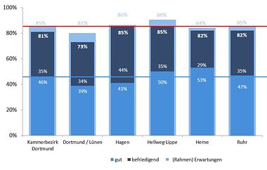 Die gedrückte Stimmung im Gesamthandwerk des Kammerbezirks findet sich mehrheitlich in den Kreishandwerkerschaftsbezirken wieder. Durchaus positiv sehen die Betriebe aus Hagen und der Hellweg-Lippe-Region die aktuelle Lage. Etwas zurückhaltender ist man in den KH-Bezirken Herne und Ruhr. Überwiegend skeptisch bewerten die Unternehmen aus Dortmund und Lünen die aktuelle Geschäftslage.