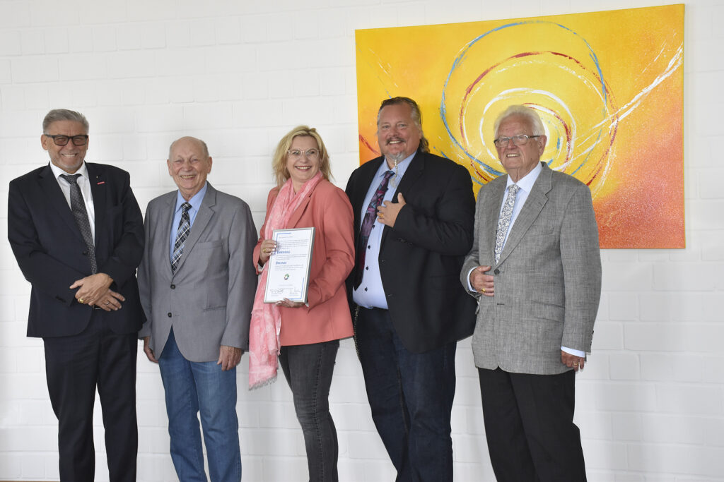 Die Lippstädter Unternehmerin Jutta Müller ist am Dienstag mit dem goldenen Ehrenring der Gebäudereiniger-Innung Dortmund ausgezeichnet worden. Die Geschäftsführerin der Liebelt Gebäudedienste GmbH & Co. KG erhielt die hohe Auszeichnung aus den Händen von Obermeister Kai-Gerhard Kullik und Geschäftsführer Volker Walters, die zur Verleihung eigens nach Lippstadt angereist waren. „Sie haben sich in vorbildlicher Weise mehr als zwei Jahrzehnte lang ehrenamtlich für die Betriebe unseres Handwerks engagiert und waren bis heute 18 Jahre im Vorstand der Innung aktiv. Diese außergewöhnliche Leistung würdigen wir heute mit dieser hohen Auszeichnung unseres Berufsstandes“, so Kai-Gerhard Kullik in seiner Laudatio. „Herzlichen Glückwunsch im Namen aller Mitgliedsbetriebe der Innung.“