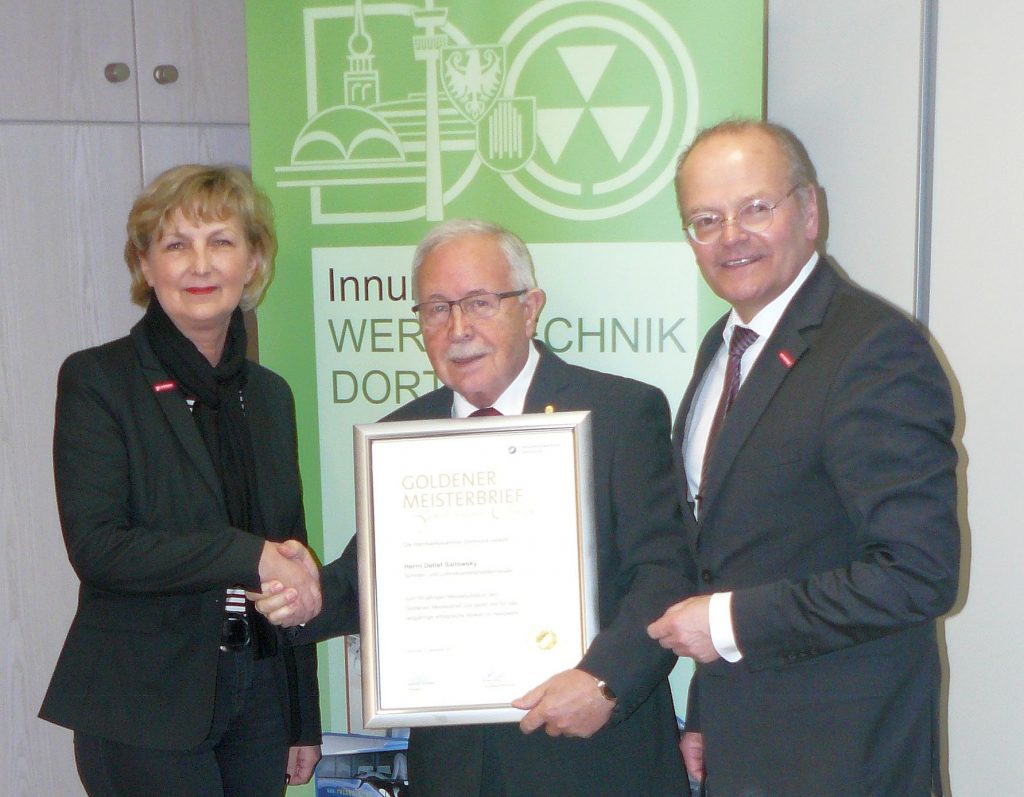Große Ehrung für Detlef Sallowsky: Der 83-jährige Ehrenbundesinnungsmeister erhielt jetzt aus den Händen der Vorsitzenden des Zentralverbands Werbetechnik, Martina Gralki-Brosch, seinen Goldenen Meisterbrief. Detlef Sallowsky, der auch Ehrenobermeister der Innung für Werbetechnik Dortmund ist, hatte 1950 seine Lehre im Schilder- und Lichtreklameherstellerhandwerk begonnen. Der gebürtige Hagener legte 1967 seine Meisterprüfung ab und war ab März 1972 geschäftsführender Gesellschafter der Firma Neon Wertz GmbH in Dortmund. Schon früh engagierte sich Detlef Sallowsky auch in „seiner“ Innung für Werbetechnik Dortmund. Er war Altgeselle, Mitglied des Gesellenprüfungsausschusses, Lehrlingswart und ab 1984 für 18 Jahre Obermeister der Innung. 1993 wurde er zum Bundesinnungsmeister des Zentralverbandes Werbetechnik gewählt und führte den Bundesinnungsverband für das Schilder- und Lichtreklameherstellerhandwerk mit großem Engagement und Weitblick zwölf Jahre lang. Die Vorsitzende des Zentralverbandes Werbetechnik, Martina Gralki-Brosch, und Geschäftsführer Ludgerus Niklas gratulierten dem Jubilar bei der Mitgliederversammlung der Innung am Donnerstag sehr herzlich und würdigten seine Verdienste für das Handwerk.