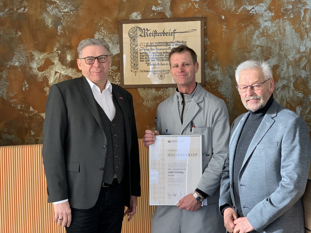 Am 29.01.2020 konnte André Stickling (Mitte) die Glückwünsche nachträglich zu seinem silbernen Meisterprüfungsjubiläum entgegennehmen. Der Jubilar, seit 1995 Geschäftsführer der Gütersloher Timmermann GmbH, hatte 1994 seine Meisterprüfung bestanden.