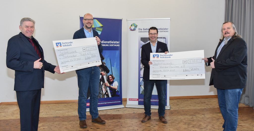 Mit zwei großzügigen Spenden in Höhe von je 6.000 Euro unterstützt die Gebäudereiniger Innung Dortmund die Dortmunder Tafel e.V. und die Hilfsorganisation Kinderlachen e.V. Obermeister Kai-Gerhard Kullik und Geschäftsführer Volker Walters übergaben jetzt die symbolischen Schecks an den Betriebsleiter der Dortmunder Tafel, Ansgar Wortmann, und den Hauptgeschäftsführer und Mitgründer des gemeinnützigen Vereins Kinderlachen, Marc Peine. „Wir haben zur Unterstützung unserer Mitgliedsbetriebe im Corona-Jahr 2020 auf 90 Prozent der Innungsbeiträge verzichtet“, erklärt Obermeister Kai-Gerhard Kullik die Beweggründe für die Aktion. „Die übrigen zehn Prozent sollen nach dem Willen aller 46 Innungsbetriebe des Gebäudereiniger-Handwerks nun einem wohltätigen Zweck zukommen.“ Dabei einigte sich die Innung darauf, das Geld dorthin zu spenden, wo die Not am größten ist, nämlich an Kinder und Menschen, die nicht genug zum Leben haben. „Das Gebäudereiniger-Handwerk ist ganz vorn mit dabei, wenn es um die Bekämpfung der Pandemie geht“, erläutert Geschäftsführer Volker Walters. „Von daher wissen unsere Betriebe sehr gut, wie wichtig Unterstützung bei dieser schweren Aufgabe ist.“