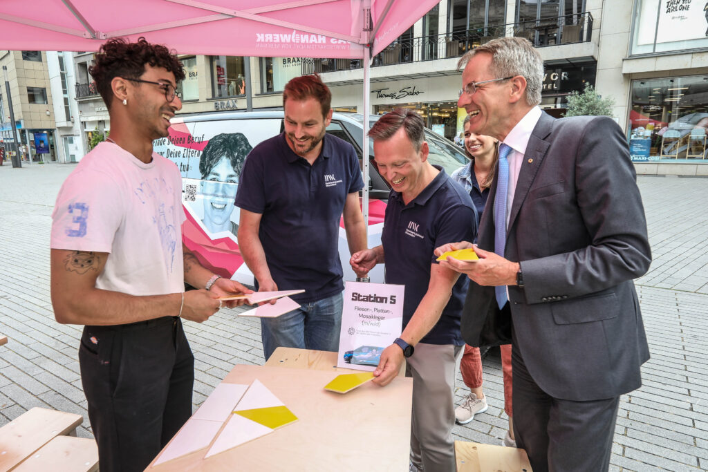 Zum Auftakt machte das Handwerksmobil am Donnerstag ganztägig Station auf dem Schadowplatz in Düsseldorf – und wurde dort nicht nur vielfach neugierig beäugt, sondern das Test-Camp zog auch jede Menge Probierwillige an. „Handwerk ist Action. Das wollen wir mitten in den Ferienspaß hinein greifbar machen. Und viele Wow-Effekte wie bei TikTok zünden, nur eben live: Frühe Könner dürfen spontan zeigen, was sie mit Werkzeug wirklich anfangen können, Neugierige mal eben mit Teigspachtel oder Fliesenzange werkeln. Und nebenbei gibt‘s reichlich Infos über die Topchancen in unseren Kreativ-, Energie- und Versorgungs-Berufen“, verspricht sich Handwerkskammer-Präsident Andreas Ehlert hohen Erlebnis- wie Erkenntniswert bei den Überraschungseinsätzen des Beratungs-Bullis. Und am Ende auch einen Impuls bei den Neuabschlüssen von Ausbildungsverträgen: „Momentan – Stand Ende Juni – sind wir nicht weit vom guten Vorjahresstand entfernt. Jetzt gilt es, in den Bemühungen nicht nachzulassen!“, informierte Ehlert zum Start der Ferienaktion.