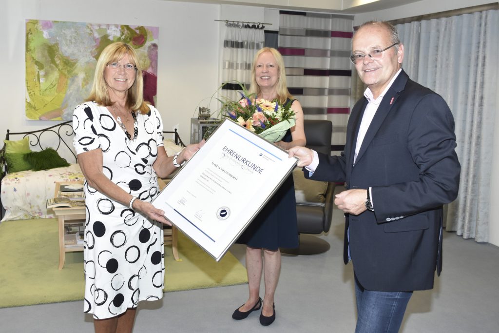 Zu einem ungewöhnlichen Jubiläum konnte jetzt die Raumausstatter-Innung Dortmund und Lünen in Aplerbeck gratulieren. Marina Thatenhorst, Angestellte im Betrieb Erlei Raum und Design GmbH & Co. KG an der Köln-Berliner Straße, beging ihr 45-jähriges Betriebsjubiläum. Innungsgeschäftsführer Ludgerus Niklas ließ es sich nicht nehmen, die Ehrenurkunde zu diesem seltenen Ereignis zusammen mit Betriebsinhaberin Regina Holland-Erlei persönlich an die Jubilarin zu überreichen. „Sie sind ein gutes Beispiel dafür, wie sicher und langlebig eine Beschäftigung im Handwerk ist“, hob der Geschäftsführer hervor. Marina Thatenhorst hatte 1975 im Alter von 15 Jahren ihre Lehre als Bürokauffrau im Betrieb begonnen, war danach übernommen worden und blieb bis heute ihrem Arbeitgeber treu.