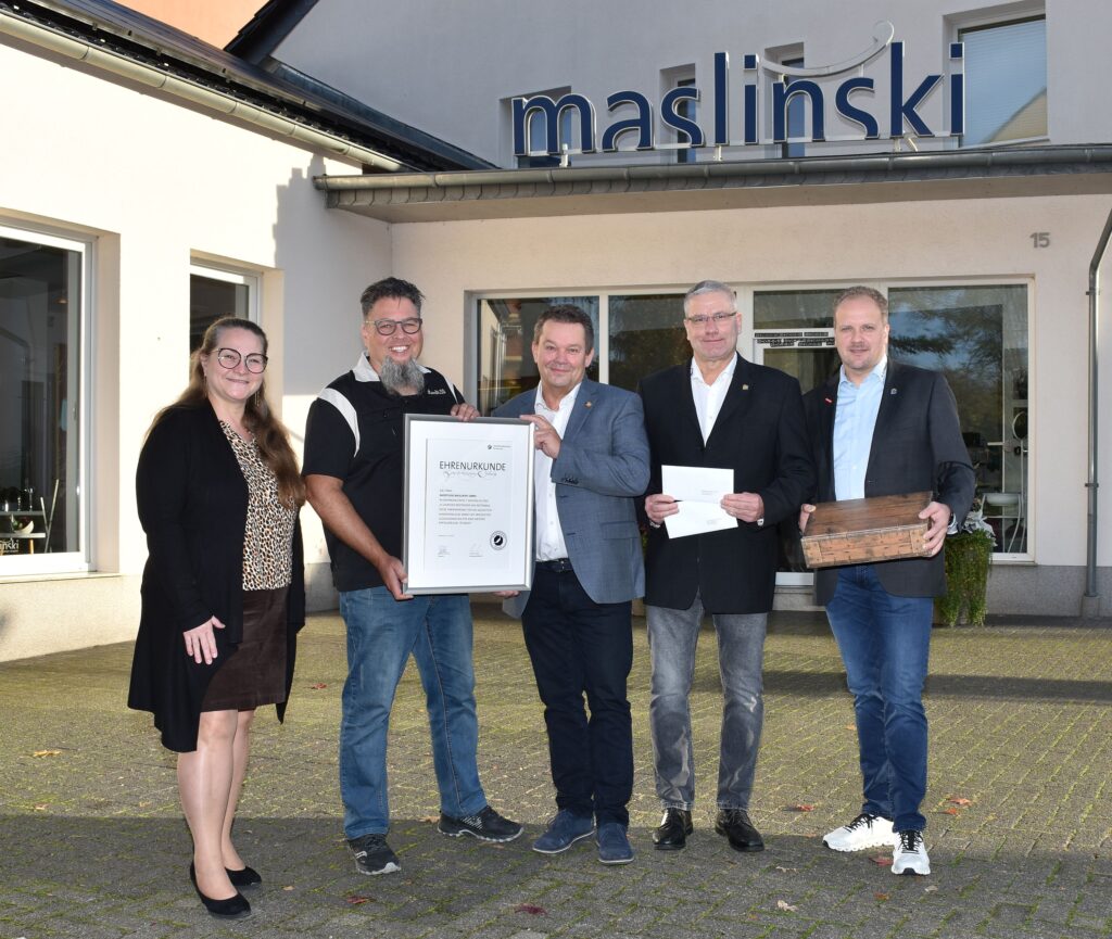 Im Juni feierte Inhaber Ingo Maslinski persönlich seinen Silbernen Meisterbrief, jetzt stand in Wambel bei der Badstudios Maslinski GmbH das 25-jährige Firmenjubiläum an. Obermeister Ralf Marx und die stellvertretenden Obermeister Alexander Schwanitz und Holger Michaelis von der Innung für Heizungs-, Sanitär- und Klimatechnik Dortmund und Lünen waren an die Rüschebrinkstraße gekommen und überbrachten am Donnerstag die Glückwünsche der Innungsbetriebe. „Der Name Maslinski steht seit einem Vierteljahrhundert für Qualität und Zuverlässigkeit“, so Obermeister Ralf Marx in seiner Laudatio. „Als Innungsfachbetrieb konnten Sie und Ihre Mitarbeiterinnen und Mitarbeiter Ihre Kunden stets überzeugen. Wir wünschen Ihnen im Namen aller Innungsbetriebe, dass Sie den Erfolg noch mindestens weitere 25 Jahre fortführen. Herzlichen Glückwunsch!”