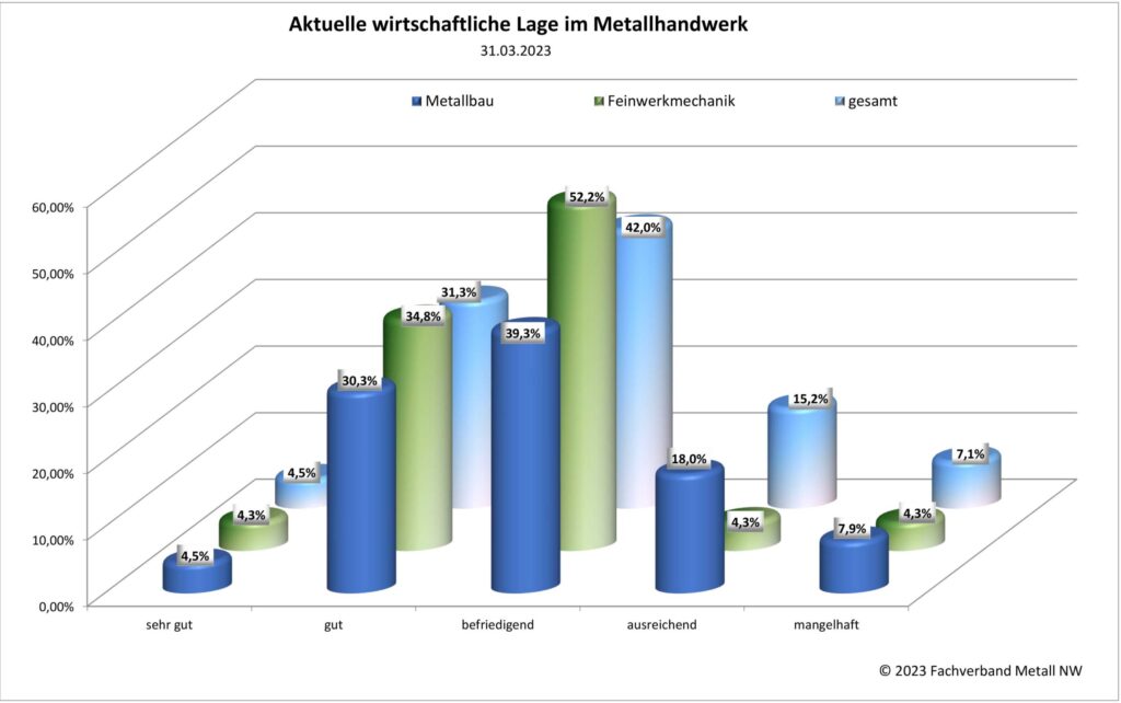„Leider ist in diesem Jahr die erhoffte Frühjahrsbelebung im Metallhandwerk ausgefallen. Die Befürchtungen des baunahen Metallbauerhandwerks über nachlassende Aufträge und die nach wie vor bestehenden Schwierigkeiten des Maschinenbaus in den Lieferketten lassen keinen nachhaltigen Optimismus aufkommen“, kommentiert Stephan Lohmann, Geschäftsführer des Fachverbandes Metall die Ergebnisse. „Zudem trübt der anhaltende, nahezu überall spürbare und einschränkende Fachkräftemangel die Stimmung bei den Unternehmern. Dieses senkt aktuell auch die Investitionsneigung im Metallhandwerk.“