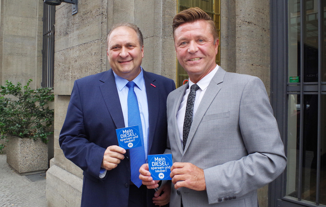 Die Autohersteller müssen endlich den Einbau moderner Systeme zur Reduzierung von Stickoxid in dafür geeignete Bestandsfahrzeuge unterstützen. Das fordern ZDH-Präsident Hans Peter Wollseifer und ZDK-Vizepräsident und Bundesinnungsmeister Wilhelm Hülsdonk. In Berlin präsentierten sie den Aufkleber „Mein Diesel: sparsam und sauber!“, mit dem das Kfz-Gewerbe für die sparsame und effiziente Diesel-Technik wirbt.