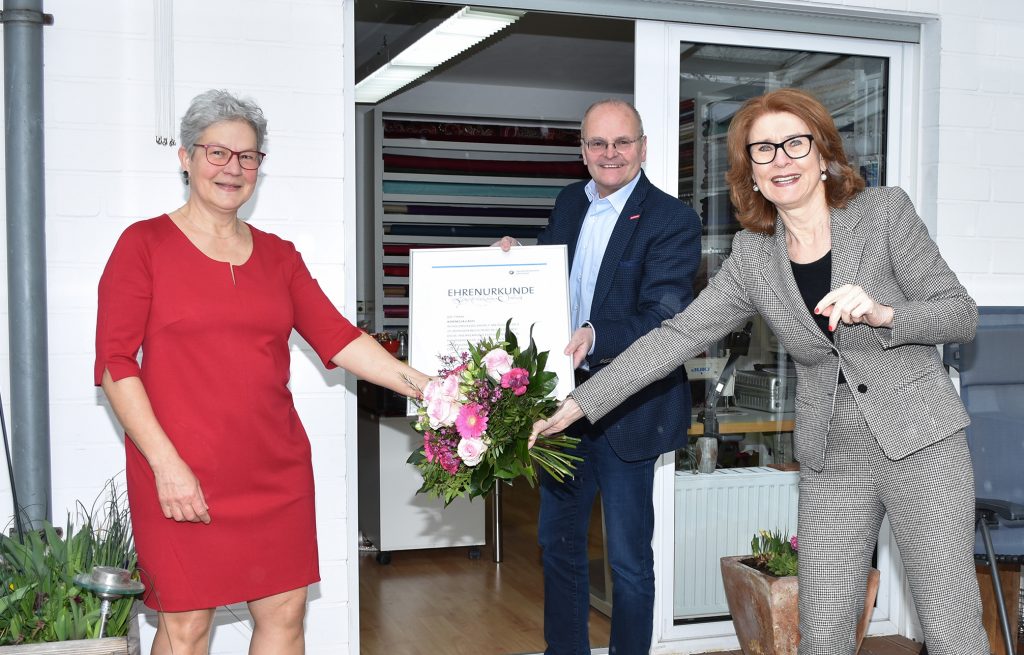 Bereits seit 25 Jahren fertigt Damenschneidermeisterin Konni Lach erfolgreich Mode für ihre Kundinnen. Anlässlich des Jubiläums ließen es sich Inge Szoltysik-Sparrer, Obermeisterin der Innung für Modeschaffendes Handwerk mittleres Ruhrgebiet und Innungsgeschäftsführer Ludgerus Niklas nicht nehmen, persönlich zur Gratulation zu kommen und die Ehrenurkunde des Handwerks zu übergeben. „Als kreative und engagierte Modeschaffende sind Sie seit Jahren eine Bereicherung für unsere Branche und die Innung. Wir wünschen Ihnen noch viele erfolgreiche Jahre“, gratulierte die Obermeisterin.