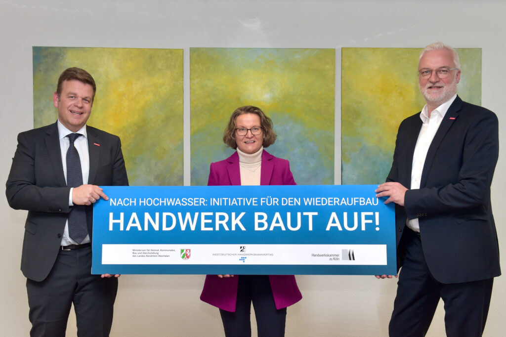 Um mehr Handwerksbetriebe für den Wiederaufbau in den von der Hochwasserkatastrophe betroffenen Gebieten zu gewinnen, hat das Ministerium für Heimat, Kommunales, Bau und Gleichstellung des Landes Nordrhein-Westfalen zusammen mit dem Westdeutschen Handwerkskammertag am 5. April 2022 eine Initiative ins Leben gerufen. Unter dem Motto »HANDWERKimWIEDERAUFBAU« haben Ina Scharrenbach, Ministerin für Heimat, Kommunales, Bau und Gleichstellung des Landes Nordrhein-Westfalen, Berthold Schröder, Präsident des Westdeutschen Handwerkkammertages e.V., sowie Matthias Heidmeier, Hauptgeschäftsführer des Westdeutschen Handwerkskammertages e.V., einen Kooperationsvertrag unterzeichnet. Zentrales Ziel ist es, mehr Handwerksfirmen – insbesondere aus den nicht vom Hochwasser betroffenen Bundesländern und dem benachbarten Ausland – für den Wiederaufbau in Nordrhein-Westfalen zu gewinnen. Eine wichtige Rolle dabei spielt die von der Handwerkskammer Koblenz initiierte digitale Plattform www.handwerk-baut-auf.de. Die Plattform soll durch die Handwerkskammer zu Köln fortentwickelt und für die betroffenen Regionen in Nordrhein-Westfalen ausgebaut werden. Teil der Initiative wird auch eine breit angelegte Informations- und Werbekampagne sein.