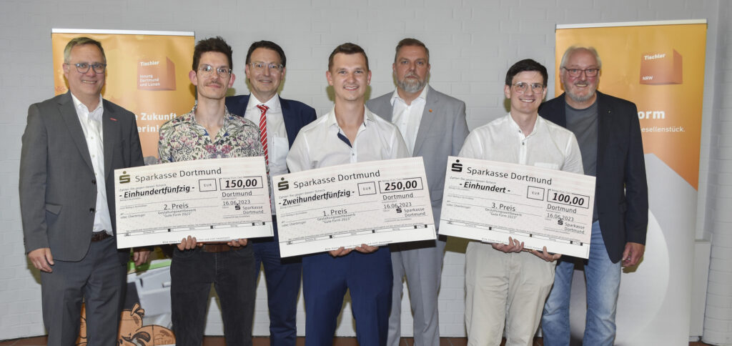Ein weiterer Höhepunkt der Veranstaltung wurde die anschließende Übergabe der Auszeichnungen im diesjährigen Gestaltungswettbewerb „Die Gute Form – Tischler gestalten ihr Gesellenstück“. Eine Fachjury hatte neun ausgewählte Gesellenstücke der Wintergesellenprüfung 2022/2023 und der Sommergesellenprüfung 2023 prämiert. Bewertet wurden die eingereichten Arbeiten nach den Kriterien Idee (Eigenständigkeit und Qualität der Idee), Form (Linienführungen, Gliederungen, Proportionen sowie Material- und Farbkomposition), Funktion (Nutzungsqualität, Handhabung und Ergonomie) sowie die werkgerechte Konstruktion. „Das handwerkliche Niveau war beeindruckend. Wir haben darum neben den drei Bestplatzierten in diesem Jahr allen Teilnehmerinnen und Teilnehmern eine Belobigung ausgesprochen“, so Obermeister Dirk Goebel. „Herzlichen Dank an alle, die ihre Arbeiten zur Verfügung gestellt haben.“ Michael Rüschenschmidt, Kundenbetreuer Firmenkunden der Sparkasse Dortmund überreichte anschließend die von dem Geldinstitut ausgelobten Preisgelder.