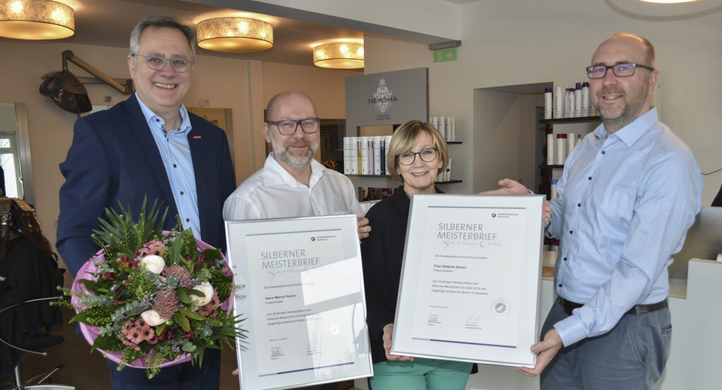 Stefanie und Marcel Kamin aus Dortmund-Wambel konnten ihre Silbernen Meisterbriefe im Friseurhandwerk entgegennehmen / Ehepaar lernte sich 1997 auf der Meisterschule kennen / Vertreter des Handwerks gratulieren zum 25-jährigen Doppel-Jubiläum