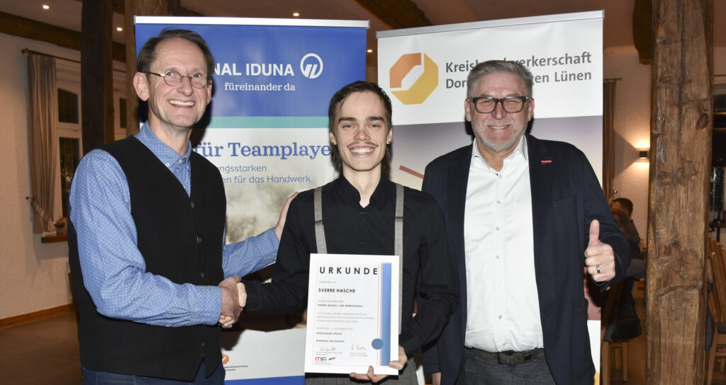 Eine Urkunde und Glückwünsche von den Vertretern der Modellbauer-Innung für die Handwerkskammerbezirke Dortmund und Münster konnte am Dienstag (14.11.) Sverre Hasche aus Bochum entgegennehmen. Der 22-jährige frischgebackene Technische Modellbauer Fachrichtung Gießerei, hatte 2023 als bester Auszubildender die Gesellenprüfung im Modellbauer-Handwerk abgelegt. Bei der Innungsversammlung der Innung im Gasthaus Frenking (Frenkings Tenne) in Ascheberg erhielt er aus den Händen von Obermeister Frank Grewer-Czytkowski und Geschäftsführer Volker Walters die Ehrenurkunde der Innung und ein Präsent. „Sie haben großes Engagement gezeigt und sich damit die besten Chancen in unserem Beruf gesichert“, so der Obermeister in seiner Laudatio. „Gesellen wie Sie braucht unser Handwerk und Ihnen stehen jetzt alle Karrierewege offen. Herzlichen Glückwunsch im Namen aller Innungskollegen!“