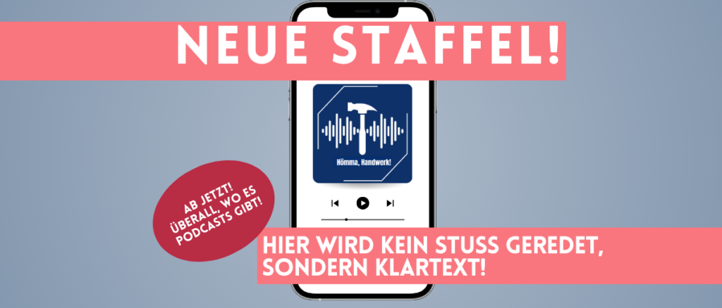 Die zweite Staffel von “Hömma, Handwerk!” ist seit Ende August auf allen gängigen Podcast-Plattformen zu finden, jeden zweiten Donnerstag erscheint eine neue Folge.