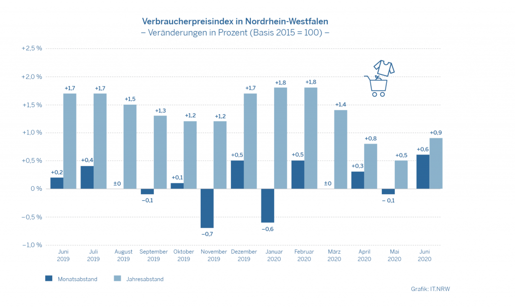 Der Verbraucherpreisindex für Nordrhein-Westfalen ist von Juni 2019 bis Juni 2020 um 0,9 Prozent gestiegen (Basisjahr 2015 = 100). Wie Information und Technik Nordrhein-Westfalen als Statistisches Landesamt mitteilt, erhöhte sich der Preisindex gegenüber dem Vormonat (Mai 2020) um 0,6 Prozent.