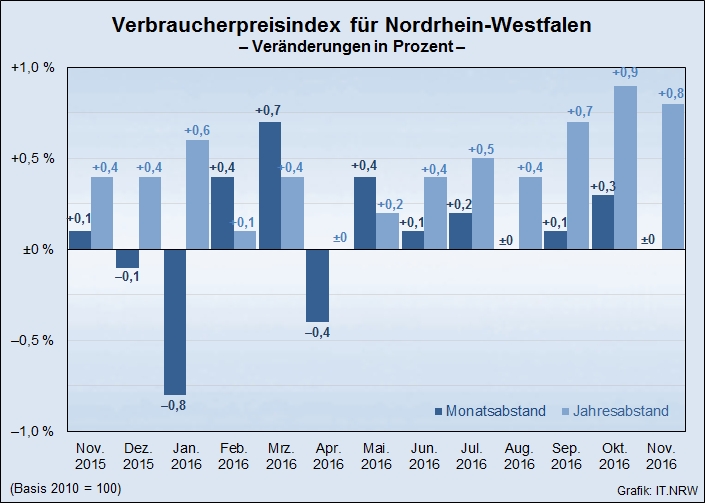 Düsseldorf (IT.NRW). Der Verbraucherpreisindex für Nordrhein-Westfalen ist von November 2015 bis November 2016 um 0,8 Prozent gestiegen. Wie Information und Technik Nordrhein-Westfalen als amtliche Statistikstelle des Landes mitteilt, blieb der Preisindex im Vergleich zum Vormonat (Oktober 2016) unverändert.