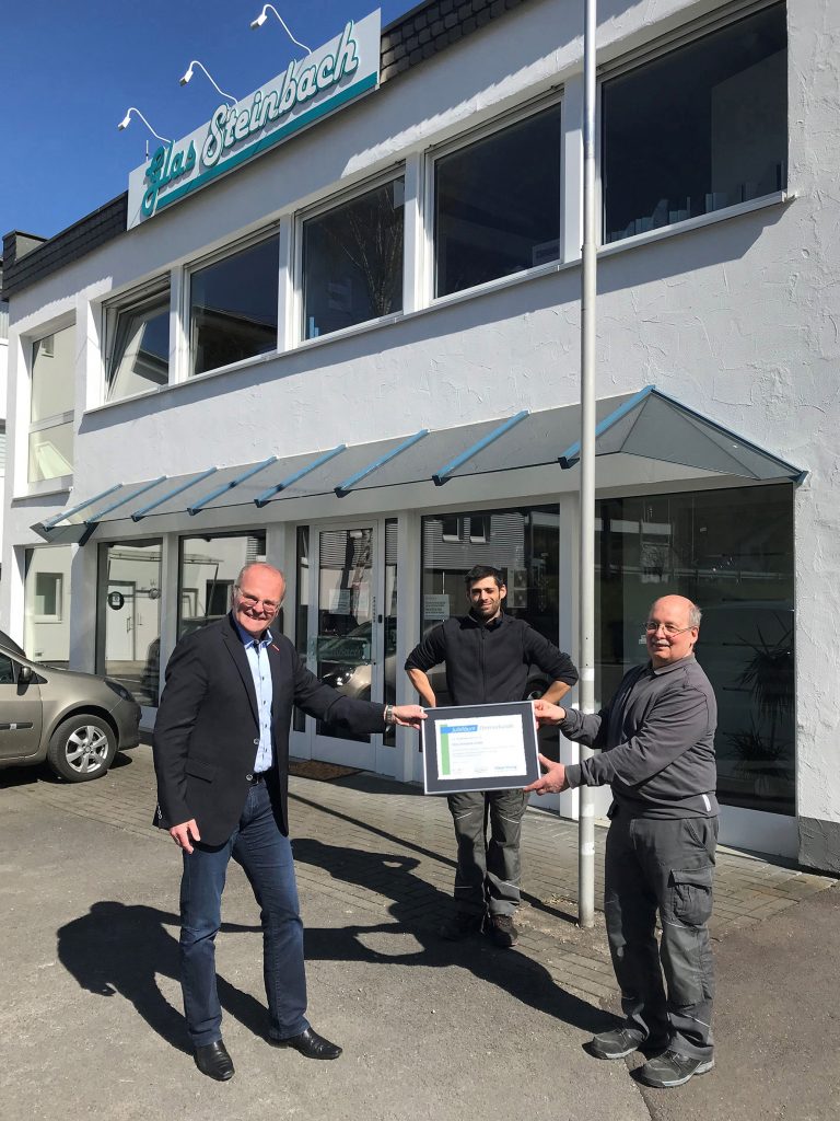 Gute Stimmung bei der Otto Steinbach GmbH aus Lennestadt-Altenhundem: Bereits seit 90 Jahren existiert das Glaser-Familien-Unternehmen erfolgreich im Sauerland und überzeugt seine Kunden durch Kompetenz und Qualität. Ludgerus Niklas, Geschäftsführer der Glaser-Innung für den Regierungsbezirk Arnsberg, ließ es sich nicht nehmen, vor Ort zu gratulieren und eine Ehrenurkunde zu überreichen. „Wir als Innung sind begeistert, wenn Familienbetriebe sich über mehrere Generationen hinweg so erfolgreich weiterentwickeln und auch mit der Zeit gehen“, freute sich der Innungs-Geschäftsführer.